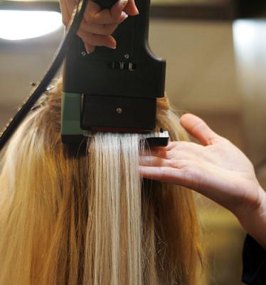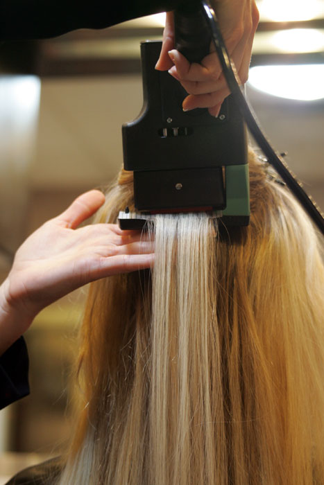 Las extensiones se coloca la cutícula mecha por mecha, en dirección hacia abajo con ayuda de unas máquinas similares a las que se utilizan en el planchado del cabello, estas activan el polímero gracias al calor.